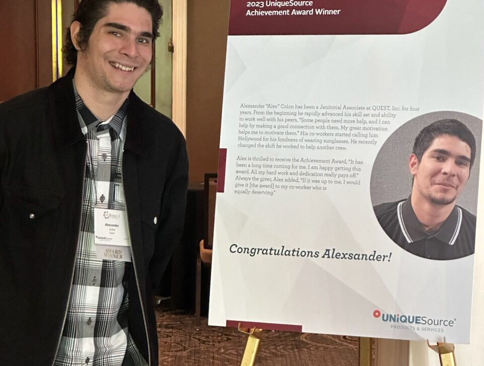 Alexsander “Alex” Colon has been a Janitorial Associate at Quest, Inc. for four years. From the beginning he rapidly advanced his skill set and ability to work well with his peers, “Some people need more help, and I can help by making a good connection with them. My great motivation helps me to motivate them.”